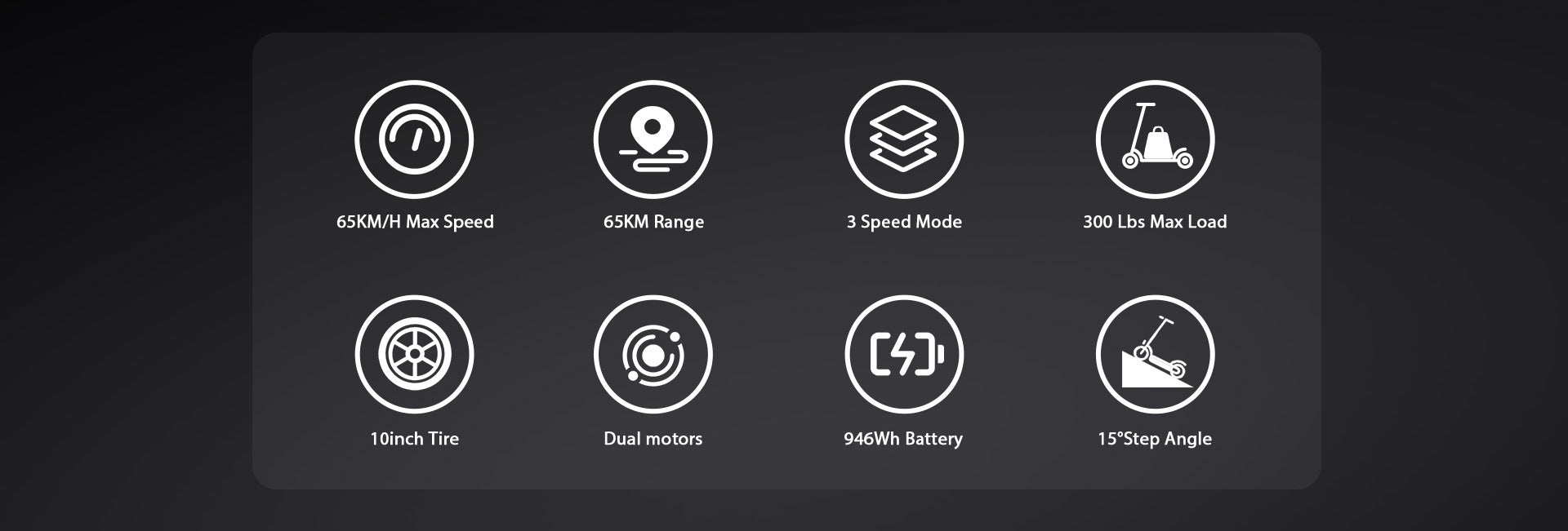 | Top Speed in each mode | 37km/h 54km/h 65km/h |