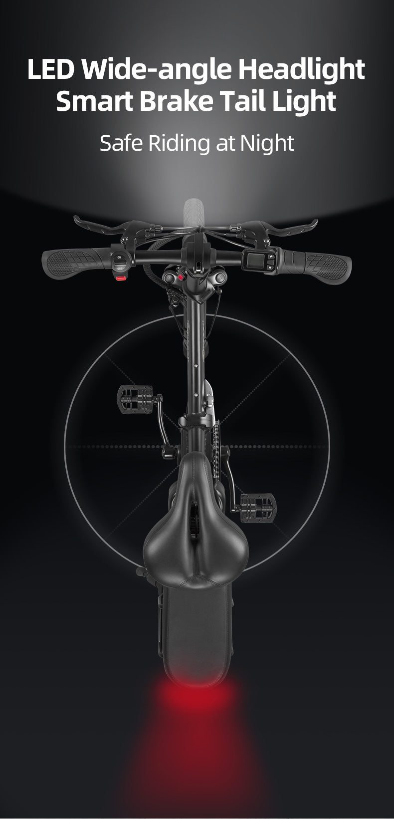 Rear-mounted carrier design, so you no longer worry about pets and accessories (you can install a basket on it). Adjustable 12V LED headlight with taillight for safer night riding.