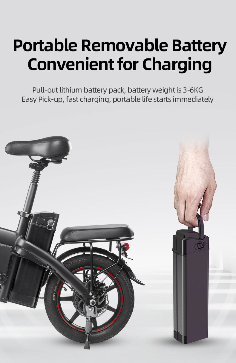 The 48V lithium battery with 7.5Ah capacity can be charged either directly on the bike or by removing it.